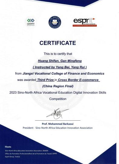 近日,“2023首届中北非国际职业教育数字化创新技能竞赛”跨境电子商务比赛在义乌工商职业技术学院成功举办,来自全国各职业院校的近350支队伍参加了该比赛。由bat365国际教育学院杨瑞、杨蓓两位老师指导的21商务英语4班黄诗凡、淦明凤获得全国决赛三等奖。