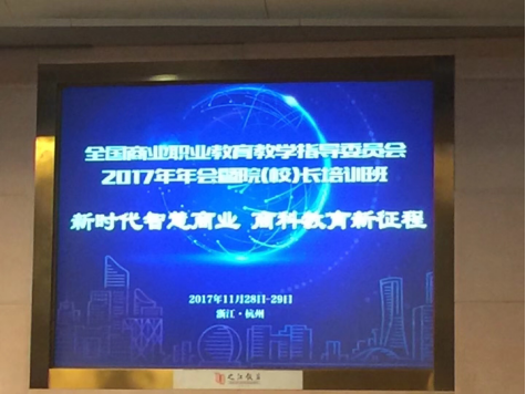 为深入推动bat365承担的江西省高职创新发展行动计划——市场营销骨干专业建设,工商管理学院武丹副院长于11月28-29日赴浙江杭州参加了全国商业职业教育教学指导委员会2017年年会暨营销专业建设培训班。商务部流通发展司副司长、全国商指委副主任委员王选庆出席并讲话。全国商指委主任委员、副主任委员、委员以及来自全国高中职院校、企业的代表近300人参加了会议。本次大会以新时代智慧商业,商科教育新征程为主题。