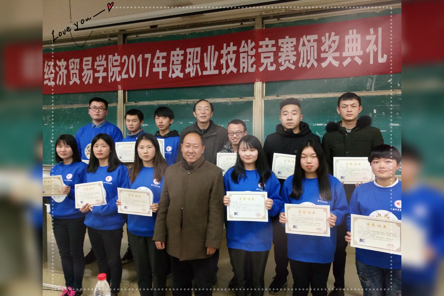 一八元月三,颁奖大会开。二零一七回首,再上新平台。电商一分为三,运营移动跨境,赢得三拳来。师生齐努力,国赛双一揣。