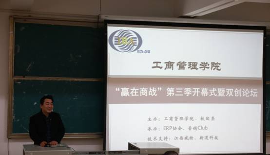 “赢在商战”自创办以来,今年为第三季。活动由工商管理学院与校团委联合主办,市场营销Club和ERP协会具体承办,新道科技、江西威特等公司提供技术支持,主要包括“营销风采秀”、“我是CEO”、双创论坛等三个项目。