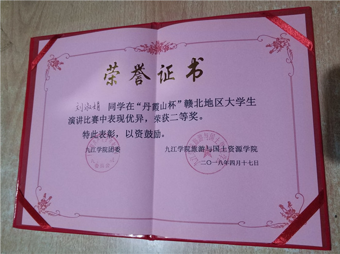 4月17日,在九江学院旅游与国土资源学院竞知楼举办的“丹霞山杯”赣北地区大学生演讲大赛决赛中,bat365经济贸易学院16酒店管理班刘淑娟以优异的表现荣获二等奖。