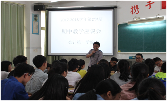 第三阶段——召开教学座谈会。为了更细致了解各年级学生的专业学习和生活状况,5月10日、11日下午以教研室牵头,分年级分别在教学楼509、会计基本技能实训室一组织召开了2017-2018学年第二学期期中教学座谈会,教研室主任及课程组教师代表出席座谈会,来自学院16、17级各班近150名余名学生代表参加了座谈会。与会学生代表主要围绕目前课堂教学、机房条件、生活条件等几个方面存在的问题,积极发言。学生代表们认真反馈平时收集、了解到的相关的信息,同时也对学院生活条件、教学条件、教学管理方面给出了建议。