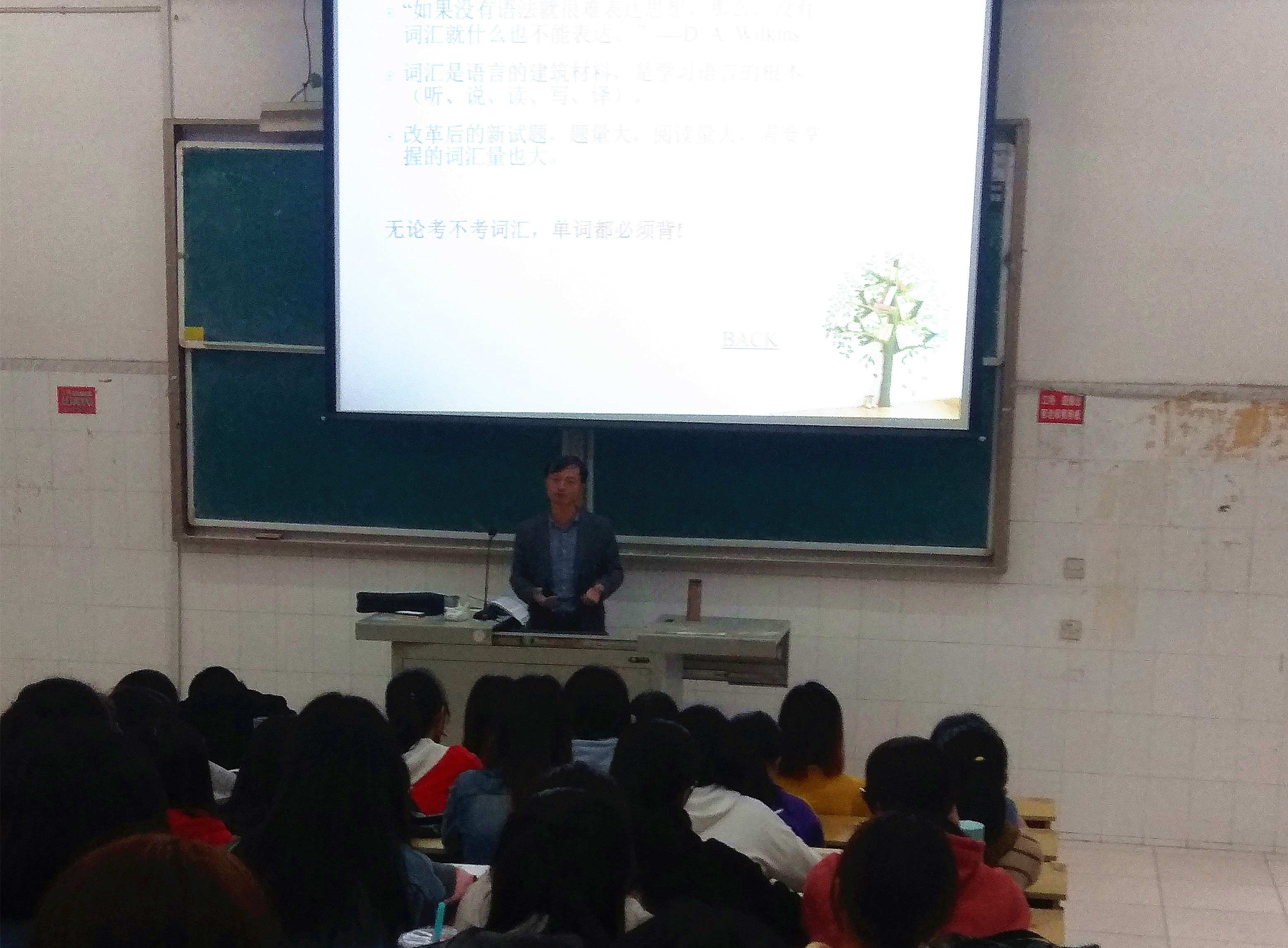为帮助bat365学生有效备考大学英语四级考试, 11月6日下午,外国语学院在教学楼609教室举办大学英语四级阅读技巧专题讲座,外国语学院副教授欧阳倍祥老师应邀担任主讲。欧阳老师长期从事英语教学工作,对大学英语四六级深有体会。本次讲座在学生中引起了热烈反响,吸引了大量学生前来听课,大教室里座无虚席。