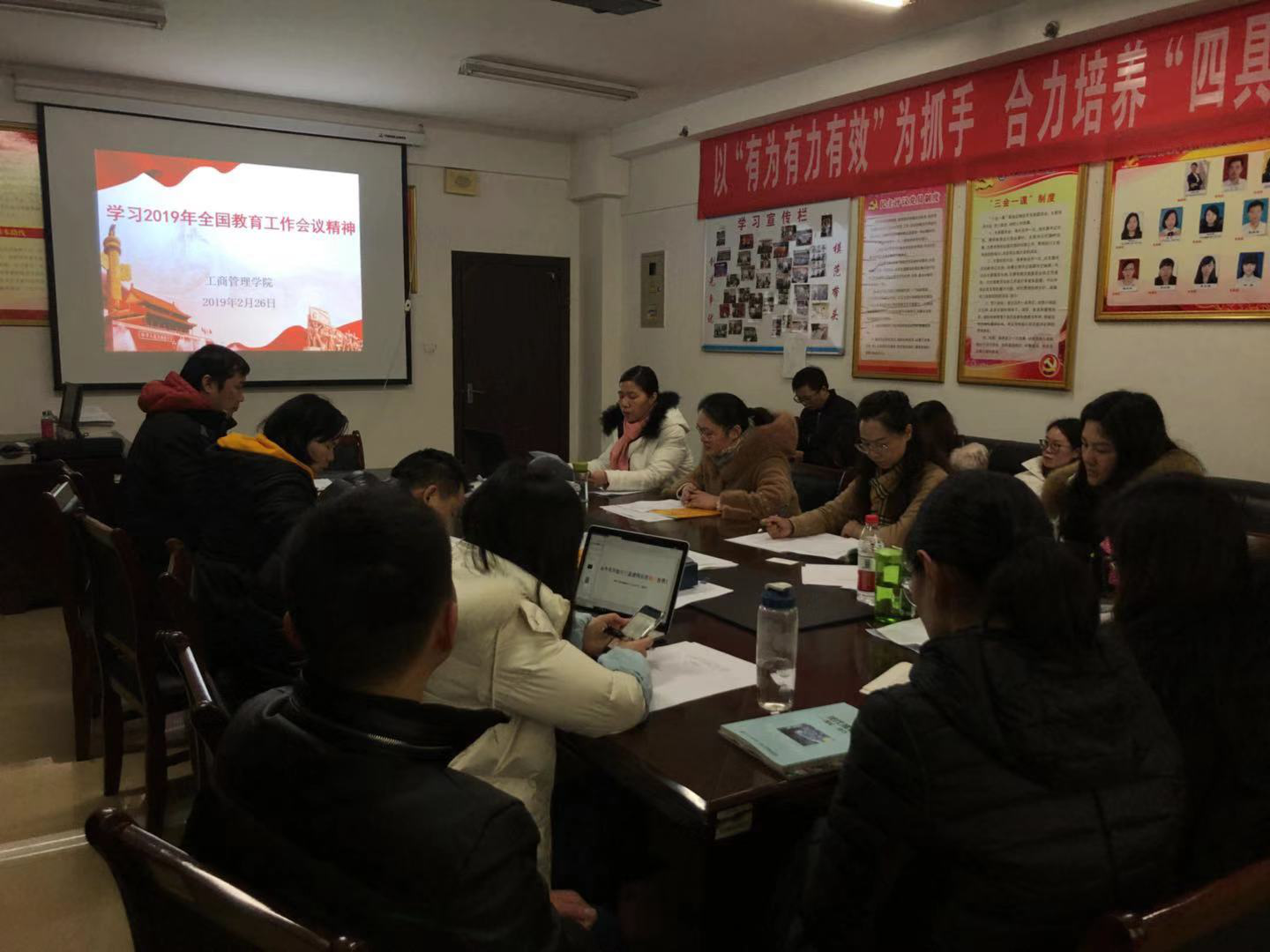 2月26日下午,工商管理学院组织全体教师在会议室召开专题学习会,传达学习了2019年全国教育工作会议精神,会议由党总支书记胡红霞同志主持。