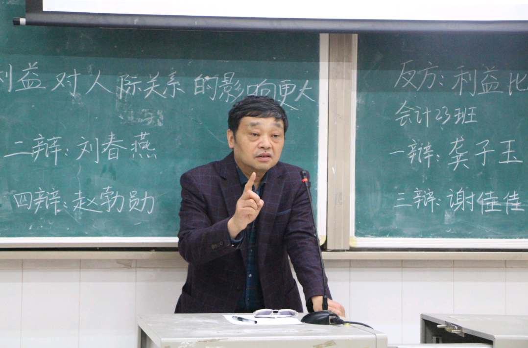 辩论赛决赛在教学楼617室进行,会计第二学院院长李洪春、党总支副书记张家顺、党政办主任孙小丽出席决赛并担任评委。经过决赛立论陈词、质询提问、攻辩小结、自由辩论、总结陈词等环节,18会计23班参赛队论点明确、论据充分、思维活跃、应对灵活,最终赢得了决赛的胜利。