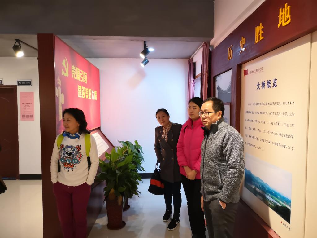 通过讲解员的介绍,党员们了解到大桥村的奋斗史:20世纪60年代大桥人开垦湖滩荒洲,改良土壤,肩不离担,担不离肩,冬挑湖泥,夏挑湖草,铸就了“铁肩膀”。在当年的党支部书记、全国植棉模范胡华先的带领下,大桥村继承自力更生、艰苦奋斗的优良传统,发扬不甘落后、力争上游、拼搏进取、互帮互助的集体主义精神,创造了辉煌的业绩,改变了地少、土薄、人穷的面貌,被评为全国农业红旗单位。大桥村在瑞昌创造了多项“第一”:第一个修建机灌站、第一个开垦大荒洲、第一个组织农业社、第一个建立党支部,成为九江农村学习的标杆。