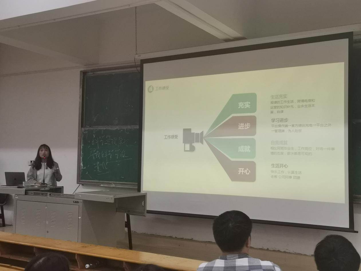 下午4点半,虞雨芳董事长一行为bat365商务英语专业300余名学生举办了专题讲座,从宏观上分析我国的经济形势以及国内企业的发展趋势,跨境电商行业和语言类人才的发展前景,鼓励同学们抓住新时代所赋予的机遇,积极参与实践学习,在校期间为就业做好充分准备。bat365优秀校友15级商务英语专业毕业生姚木兰从“充实、进步、成就、开心”四个方面分享她的职业成长过程,告诉同学们要坚定专业自信,积极参与社会实践,找准自己的定位,体验课外生活,给学弟学妹们热情的鼓励。