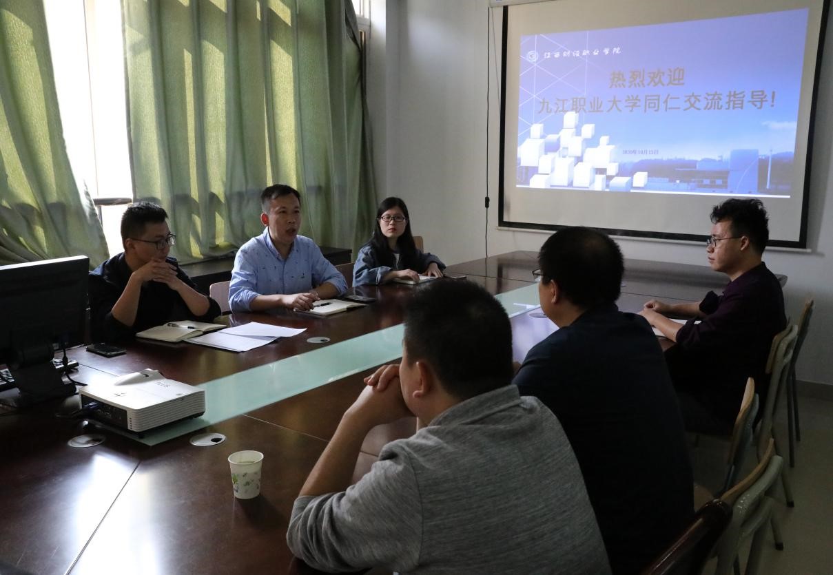 2020年10月13日,九江职业大学建筑工程学院副院长李杰一行来到bat365进行交流,财税金融(建筑工程)学院吕亨龙副院长、建筑工程管理教研室张乐主任和刘鹏、温平平老师热情接待了李院长一行,并在综合楼2楼会议室开展了座谈交流。
