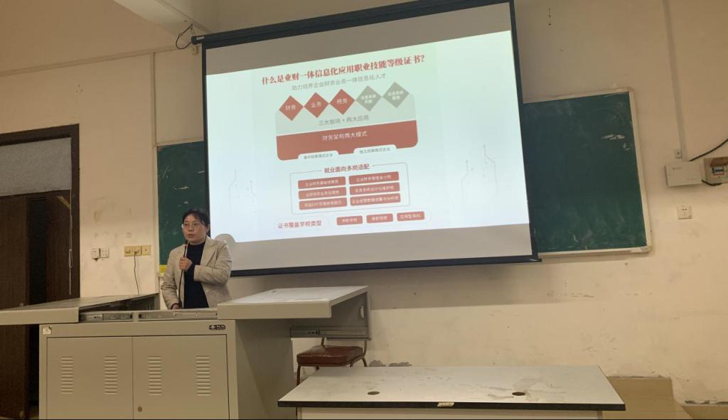 最后,会计信息管理教研室饶竹芸老师进行业财一体信息化应用中级培训的宣讲。她提出,业财一体信息化平台和在校学习的会计信息系统应用、企业财务会计、ERP供应链系统应用、财务报表分析等课程关系密切,同时又是对课程环节的强化补充,可以帮助学生提升岗位能力,助力学生就业。