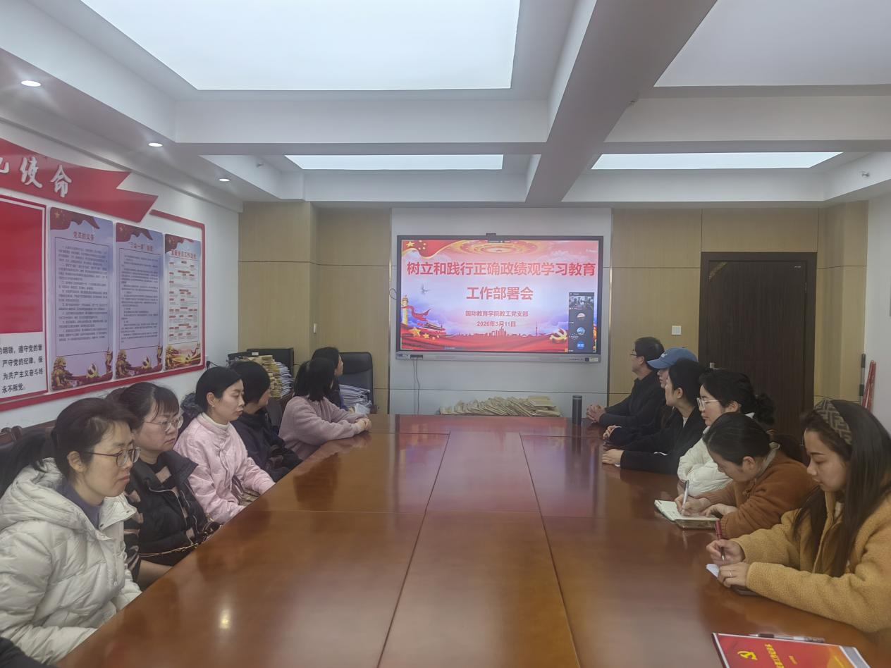 3月11日,国际教育学院党总支召开专题会议,深入学习贯彻习近平总书记关于树立和践行正确政绩观的重要论述,传达学习中共中央办公厅《关于在全党开展树立和践行正确政绩观学习教育的通知》精神,以及党中央、省委、校党委相关会议部署要求,研究部署国际教育学院树立和践行正确政绩观学习教育各项工作。院党总支副书记欧阳倍祥主持会议,学院领导班子成员、党总支委员、各支部委员及全体党员教师参加会议。